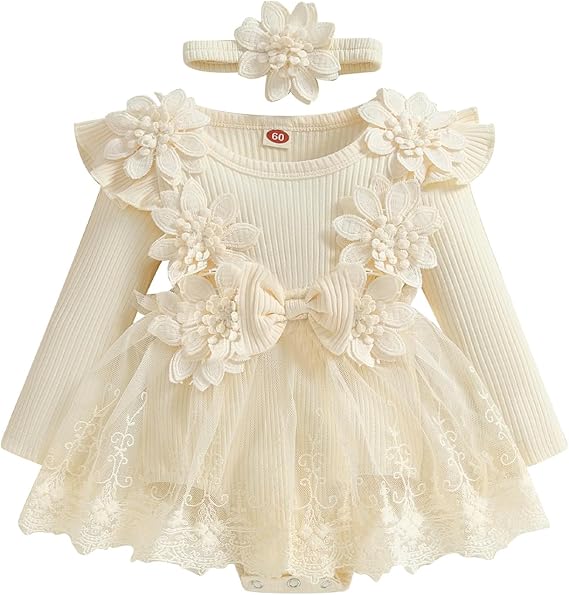 Infant Baby Girl Romper Dress Baby Dress Romper Flowers Lace Fall Winter Festival Clothes with Headband