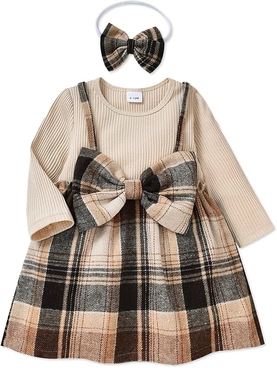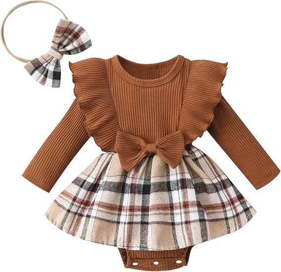 Toddler Baby Girl Fall Winter Outfit Set Plaid Romper Dress Ruffles Long Sleeve Clothes Jumpsuit with Bow Headband