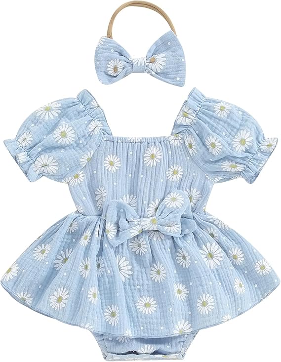Baby Girls Daisy Romper Bowknot Bodysuit+Headband Short Sleeve Playsuits Floral Jumpsuit Infant Summer Clothes